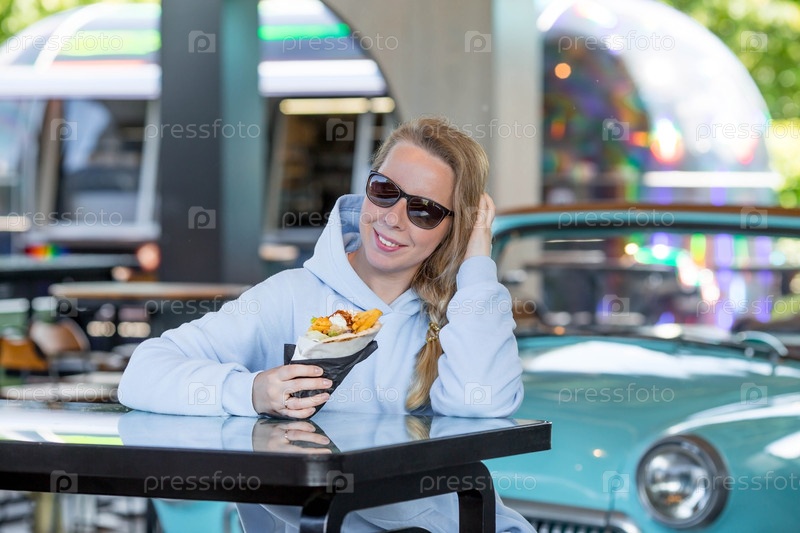 Молодая женщина ест вкусный гиро в ресторане быстрого питания на свежем воздухе.Девушка улыбается и счастлива