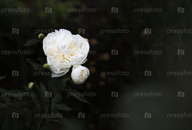 Близкий план цветущего белого пиона. Цветок и бутоны в капельках дождя. Зеленый природный фон. Цветящий сад. Красивый бокех