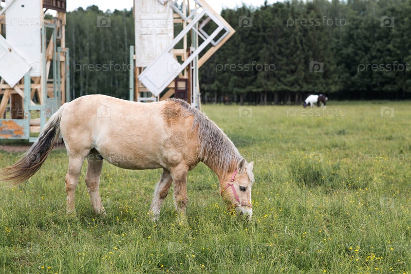 Красивые лошади на пастбище. Лошади в лужайке. Животноводство. Прекрасный природный пейзаж