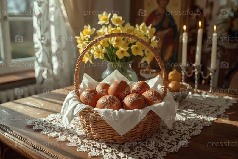 Православный Пасхальный праздник - это пасхальные яйца в корзине из уксуса, иконы, лица святых, цветы, церковные свечи и пасхальное украшение на деревянном столе в старом деревенском доме
