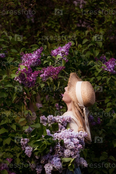 Красивая молодая женщина в ретро одежде, соломенной шляпе и с букетом лилии в цветущем саду