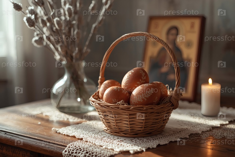Православный Пасхальный праздник - это пасхальные яйца в корзине из уксуса, иконы, лица святых, цветы, церковные свечи и пасхальное украшение на деревянном столе в старом деревенском доме
