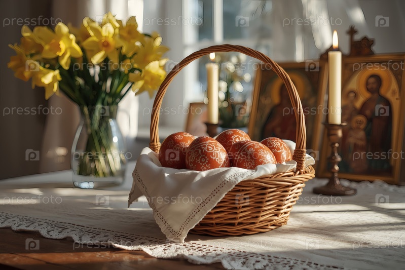Православный Пасхальный праздник - это пасхальные яйца в корзине из уксуса, иконы, лица святых, цветы, церковные свечи и пасхальное украшение на деревянном столе в старом деревенском доме