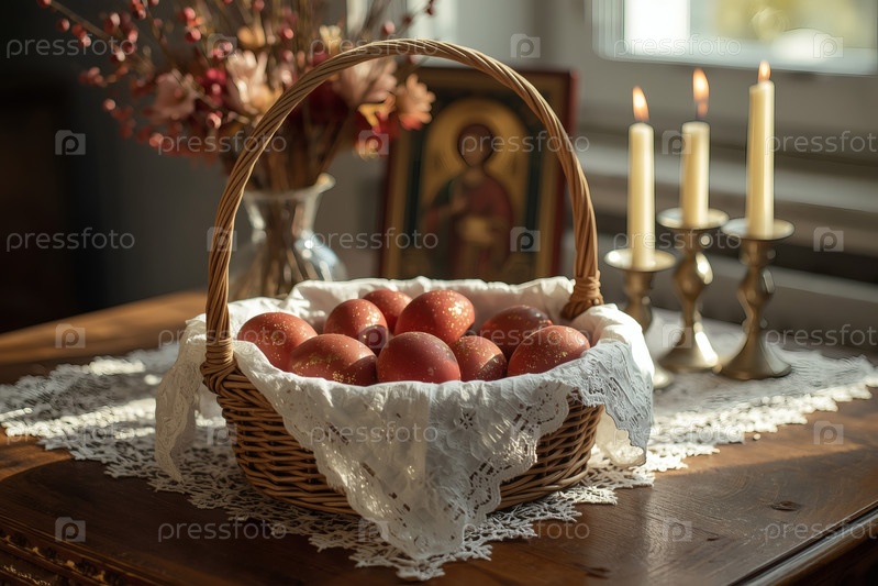 Православный Пасхальный праздник - это пасхальные яйца в корзине из уксуса, иконы, лица святых, цветы, церковные свечи и пасхальное украшение на деревянном столе в старом деревенском доме