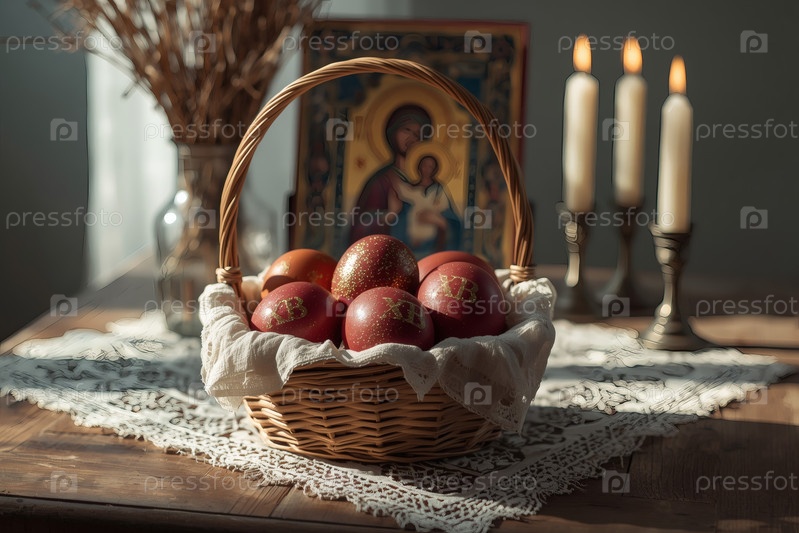 Православный Пасхальный праздник - это пасхальные яйца в корзине из уксуса, иконы, лица святых, цветы, церковные свечи и пасхальное украшение на деревянном столе в старом деревенском доме