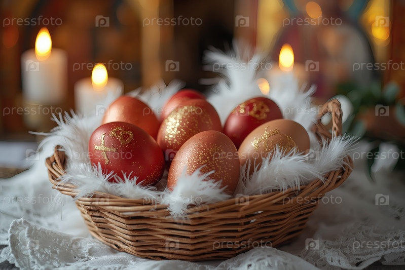 Православный Пасхальный праздник - это пасхальные яйца в корзине из уксуса, иконы, лица святых, цветы, церковные свечи и пасхальное украшение на деревянном столе в старом деревенском доме