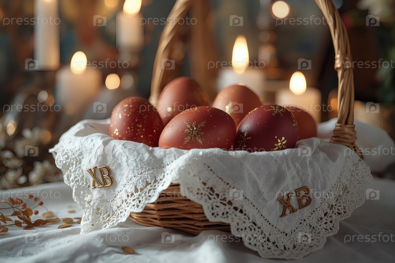 Православный Пасхальный праздник - это пасхальные яйца в корзине из уксуса, иконы, лица святых, цветы, церковные свечи и пасхальное украшение на деревянном столе в старом деревенском доме