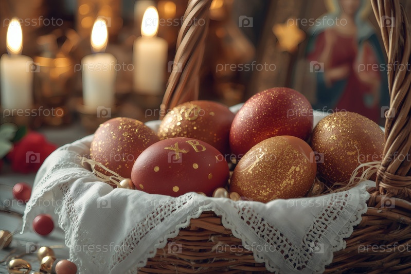 Православный Пасхальный праздник - это пасхальные яйца в корзине из уксуса, иконы, лица святых, цветы, церковные свечи и пасхальное украшение на деревянном столе в старом деревенском доме