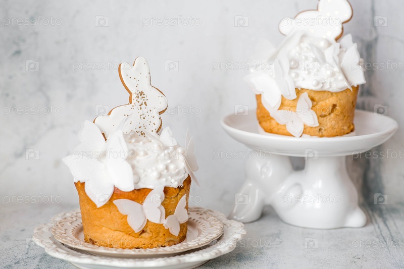 Пасхальный торт с белым кроликом и воздушными рисовыми бумажными бабочками на светлом мраморном фоне