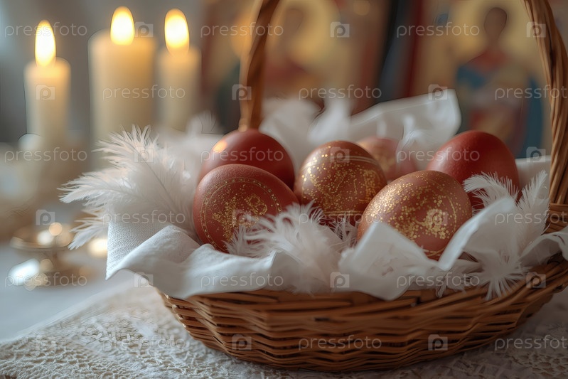 Православный Пасхальный праздник - это пасхальные яйца в корзине из уксуса, иконы, лица святых, цветы, церковные свечи и пасхальное украшение на деревянном столе в старом деревенском доме