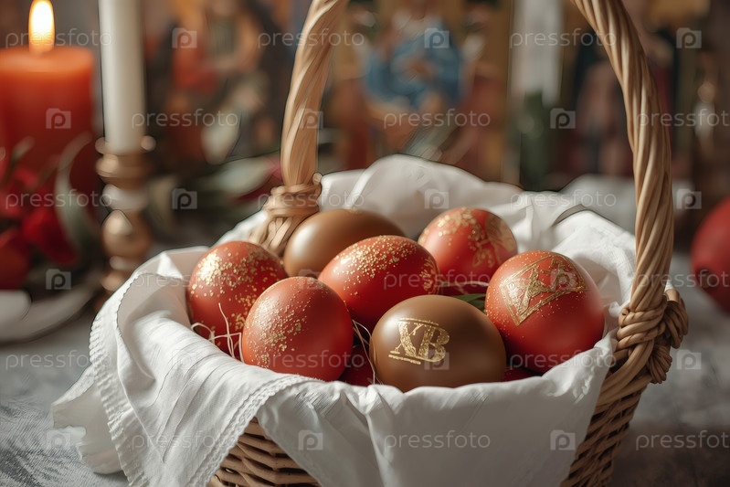 Православный Пасхальный праздник - это пасхальные яйца в корзине из уксуса, иконы, лица святых, цветы, церковные свечи и пасхальное украшение на деревянном столе в старом деревенском доме