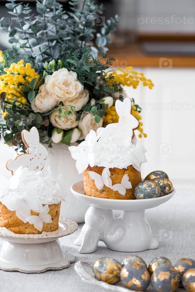 Счастливая Пасха 2026. пасхальный торт с белым кроликом и бабочками, пасхальные яйца со золотом, свечи и весенний букет цветов на столе. стильная пасхальная натюрморт