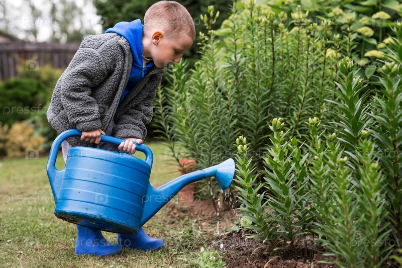 Концепция садоводства, содержания сада и обучения ребенка работе.Мальчик с голубой баночкой поливает растения и цветы в летнем саду на открытом воздухе