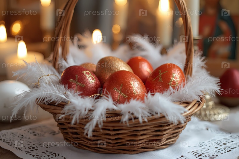 Православный Пасхальный праздник - это пасхальные яйца в корзине из уксуса, иконы, лица святых, цветы, церковные свечи и пасхальное украшение на деревянном столе в старом деревенском доме