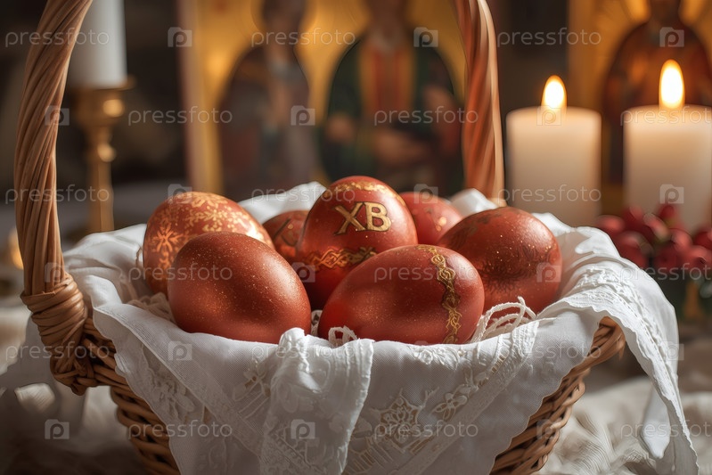 Православный Пасхальный праздник - это пасхальные яйца в корзине из уксуса, иконы, лица святых, цветы, церковные свечи и пасхальное украшение на деревянном столе в старом деревенском доме