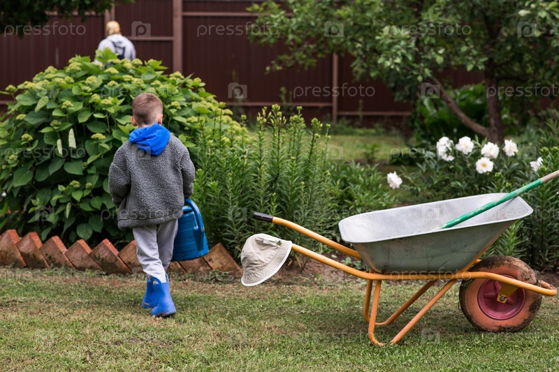 Мальчик с садовым тележком на заднем дворе дома. Концепция огородничества, сельской жизни и обучения ребенка работе. Подготовка и уборка сада. Закрытие летнего сезона