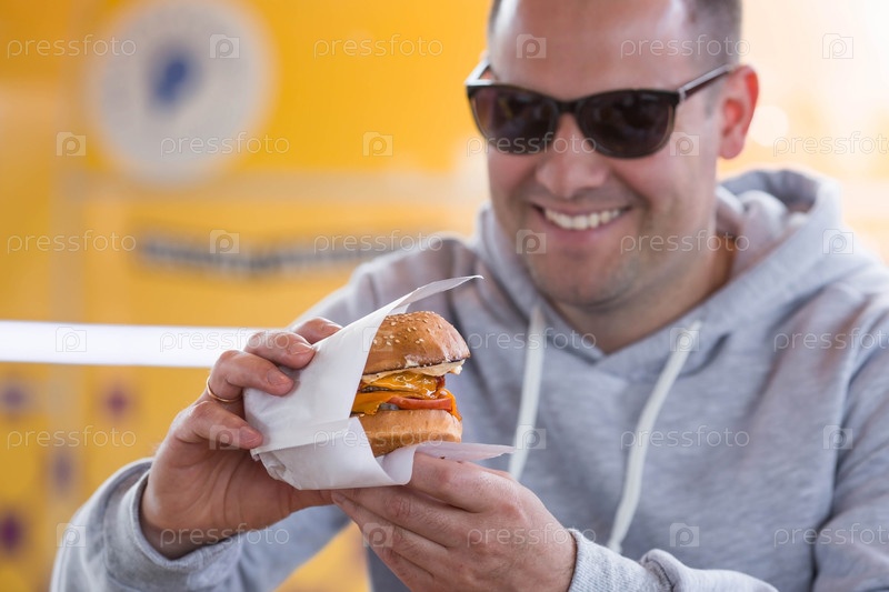 Молодой человек ест вредный вкусный бургер в ресторане быстрого питания на свежем воздухе.Мужчина улыбается и счастлив