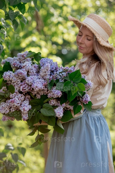 Красивая молодая женщина в ретро одежде, соломенной шляпе и с букетом лилии в цветущем саду