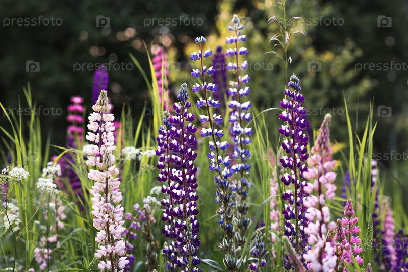 Цветящий люпин (Lupinus polyphyllus).Цветущие полевые крупнолистные или садовые люпины в начале лета, ближайший снимок с выборочным фокусом