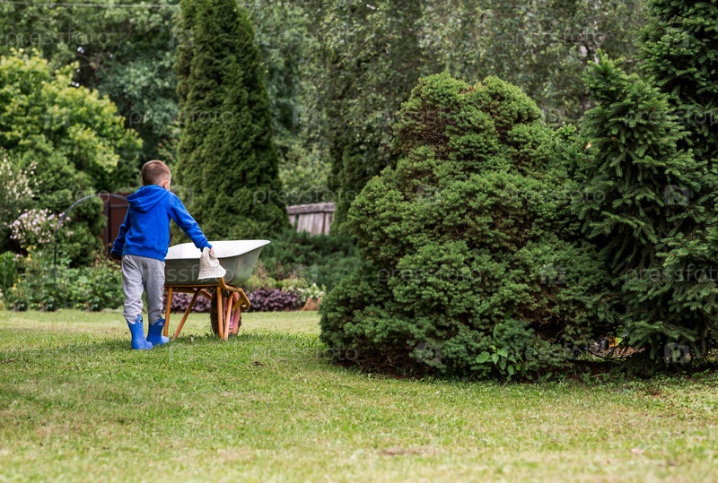 Мальчик с садовым тележком на заднем дворе дома. Концепция огородничества, сельской жизни и обучения ребенка работе. Подготовка и уборка сада. Закрытие летнего сезона