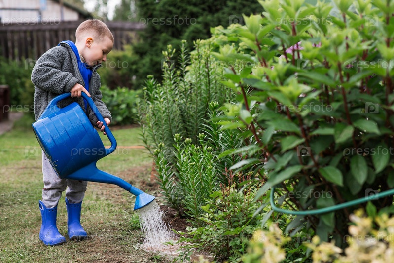 Концепция садоводства, содержания сада и обучения ребенка работе.Мальчик с голубой баночкой поливает растения и цветы в летнем саду на открытом воздухе