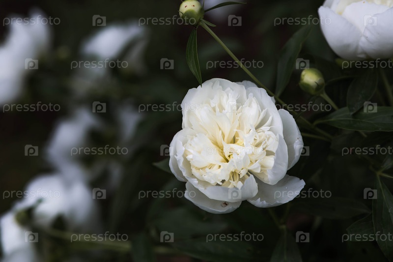 Близкий план цветущего белого пиона. Цветок и бутоны в капельках дождя. Зеленый природный фон. Цветящий сад. Красивый бокех