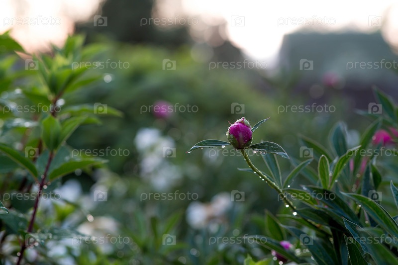 Близкий план цветущего розового пиона. Цветок и бутоны в капельках дождя. Зеленый природный фон. Цветящий сад. Красивый бокех