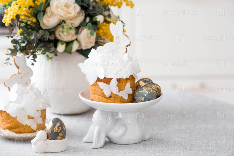 Счастливая Пасха 2026. пасхальный торт с белым кроликом и бабочками, пасхальные яйца со золотом, свечи и весенний букет цветов на столе. стильная пасхальная натюрморт