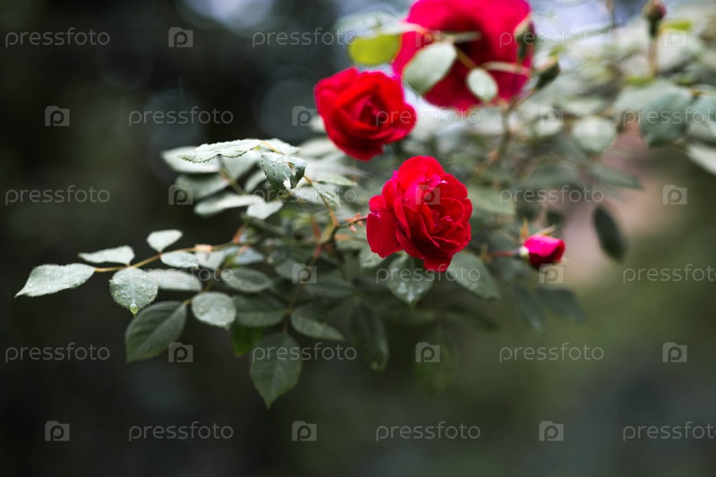 Красные розы в саду при закате солнца. фоновое изображение зелено-красное. естественный, экологически чистый природный фон. копия места для текста