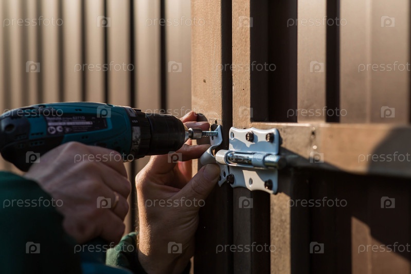 Мужчина-ремесленник использует электрическую отвертку для крепления замка на двери.Мужчина устанавливает металлический дверной шарнир с помощью дреля.Строительная работа