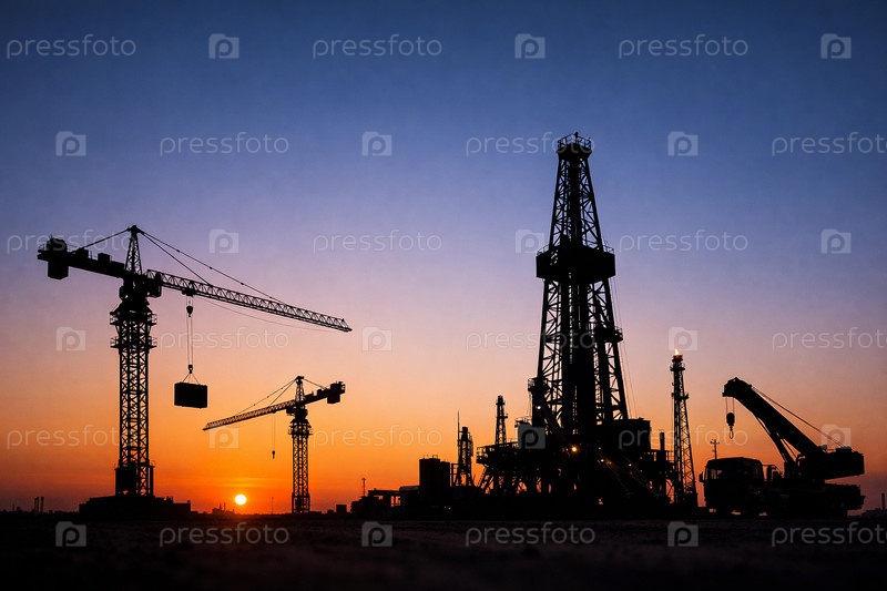 Силуэт нефтяной вышки и строительных кранов на промышленной площадке на фоне красочного заката — индустриальный пейзаж добычи нефти и тяжелой техники