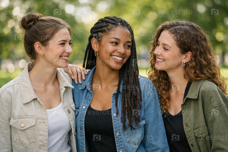 Три молодые женщины/девушки в повседневной одежде на прогулке в городском парке — дружеская поддержка, рука на плече, летний день