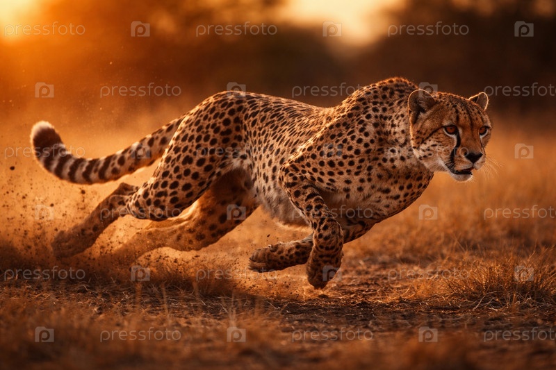 Гепард (Acinonyx jubatus) в стремительном прыжке по африканской саване на закате динамический портрет хищника, поднимающего пыль в золотом свете золотой час