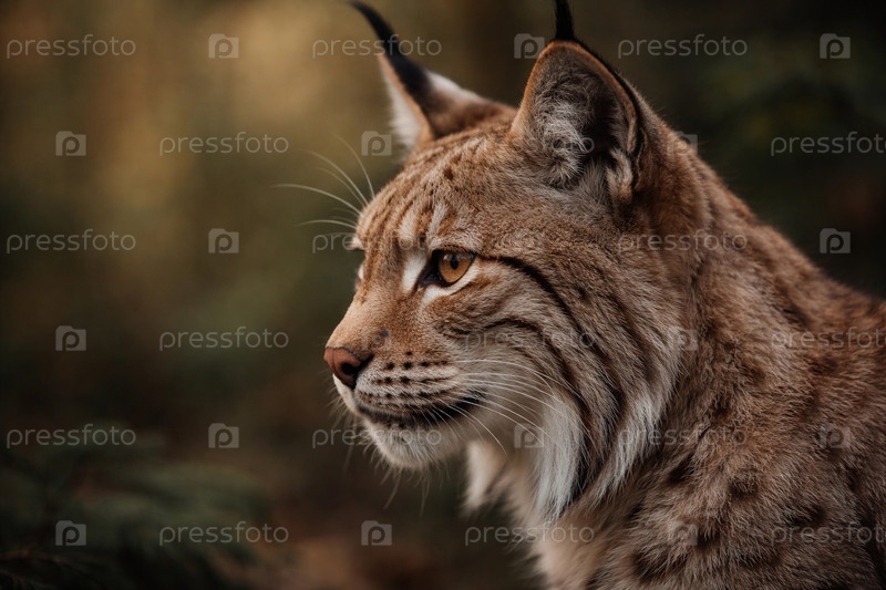 Крупный план евразийской рыси в профиль на фоне размытых осенних деревьев — портрет дикой кошки в естественной среде
