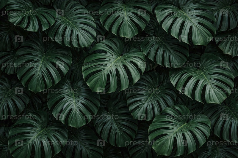 Плотный ковер из темно-зеленых листьев монстра (Monstera deliciosa) в крупном плане тропическая текстура, характерные прорезы и узоры листового листа для фона, обоев и декоративного дизайна