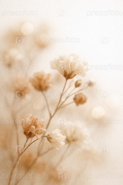 Нежные засушенные соцветия гипсофилы на тонких стеблях в мягкой бежево-сепийной гамме — макросъемка с размытым фоном и боке для романтического минималистичного натюрморта
