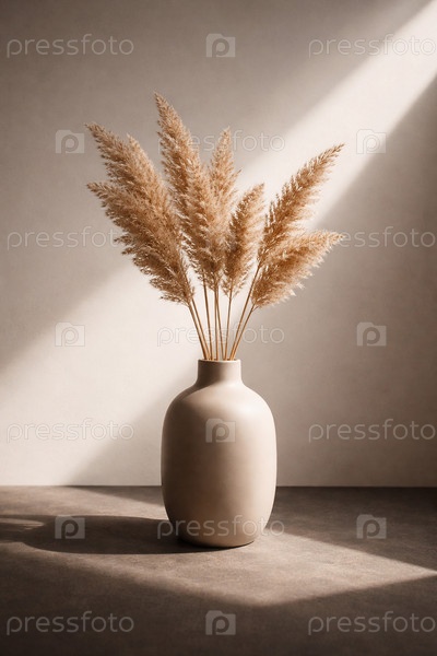 Минималистичная интерьерная композиция: матовая керамическая ваза с сухими соцветиями пампасной травы на столе в мягком солнечном свете