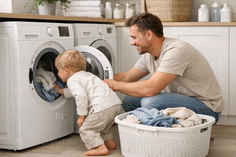 Отец и маленький сын загружают белье в фронтальную стиральную машину в светлой современной прачечной — теплая семейная сцена помощи по дому и обучение бытовым навыкам