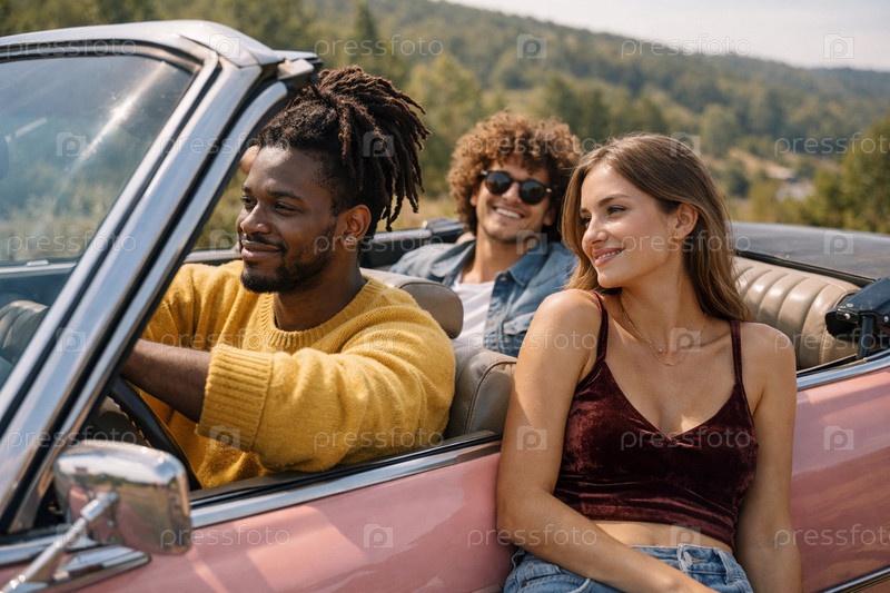 Трое друзей в розовом ретро-кабриолете на летней загородной дороге — стильный дорожный роадтрип, ощущение свободы и отдыха на фоне живописного пейзажа