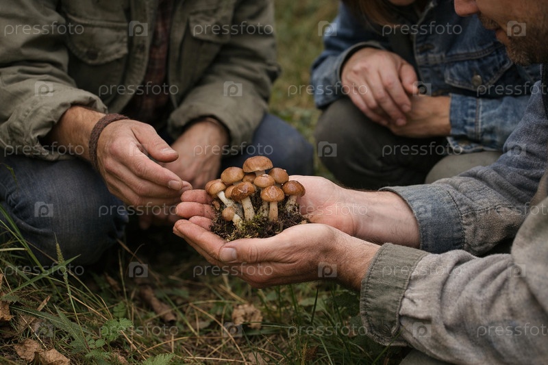 Люди держат в ладонях пучок собранных лесных коричневых грибов / опят на травянистой осенней поляне — крупный план рук и даров природы