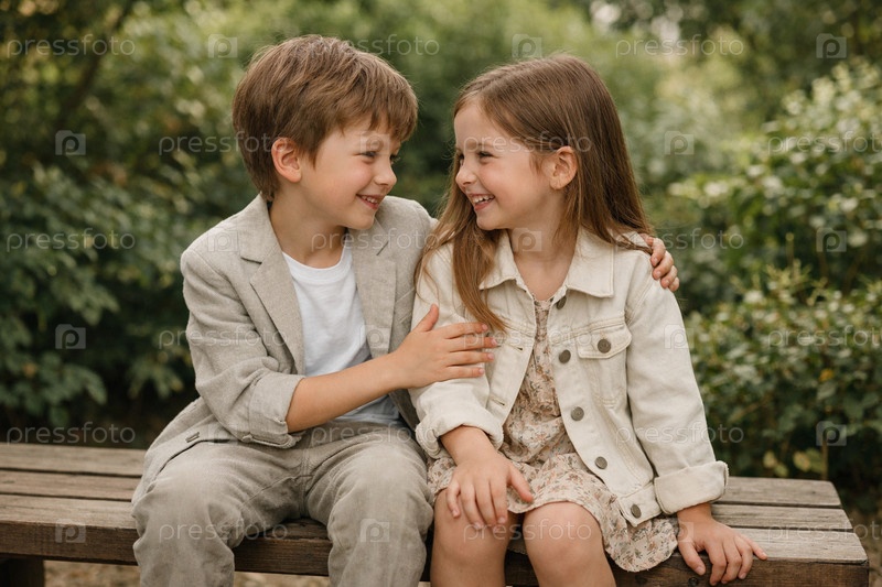 Мальчик и девочка сидят на скамейке в парке: дружеский момент с объятием и поддержкой в зеленом осеннем окружении