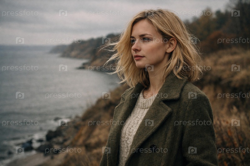 Женщина в теплом свитере и зеленом пальто на утесе у морского побережья осенним ветреным днем — атмосферный портрет на фоне скалистого берега и пасмурного неба