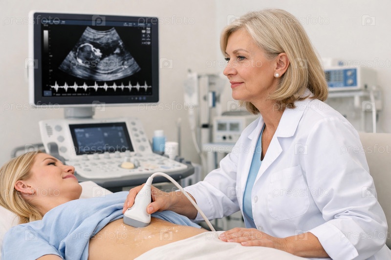 Врач-гинеколог проводит абдоминальное УЗИ беременной пациентки в современной клинике: монитор с изображением плода и кардиотокограммой