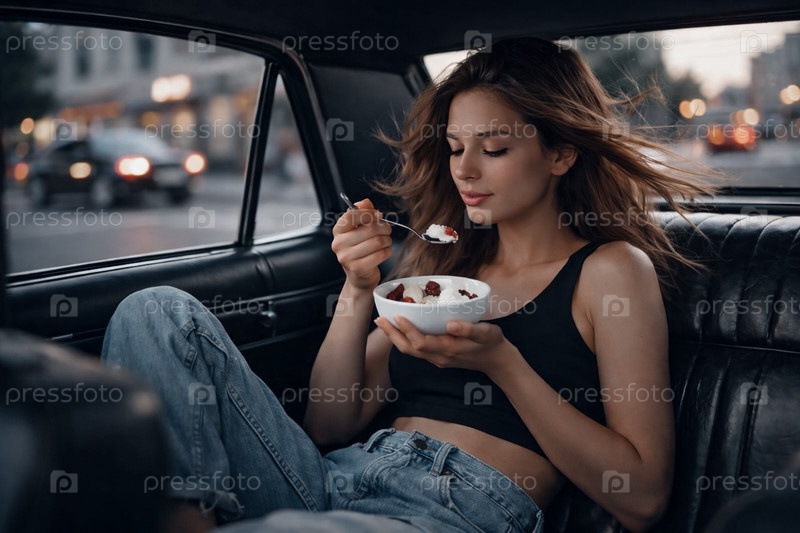 Молодая женщина/девушка в джинсах и черном кроптопе наслаждается йогуртом с клубникой в салоне автомобиля на фоне городской улицы — летний непринужденный завтрак в дороге, лайфстайл-снимок
