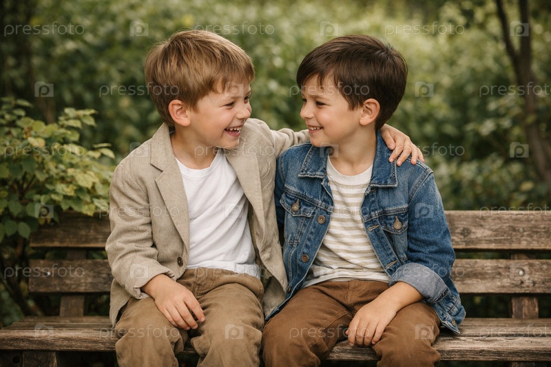 Двое мальчиков в повседневной одежде сидят на скамейке в парке: дружеский момент с объятием и поддержкой в зеленом осеннем окружении