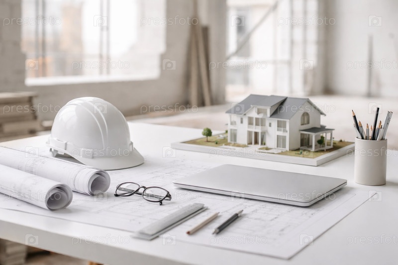 Рабочее место архитектора на стройплощадке: ноутбук, защитная каска, архитектурный макет двухэтажного жилого дома и проектные чертежи
