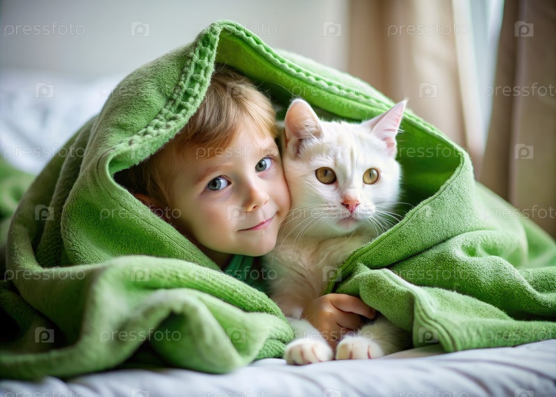 Молодой мальчик и белая кошка, уютные под зеленым одеялом