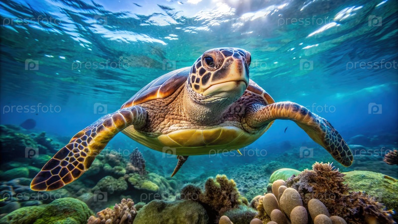 Морская черепаха плавает через яркий коралловый риф