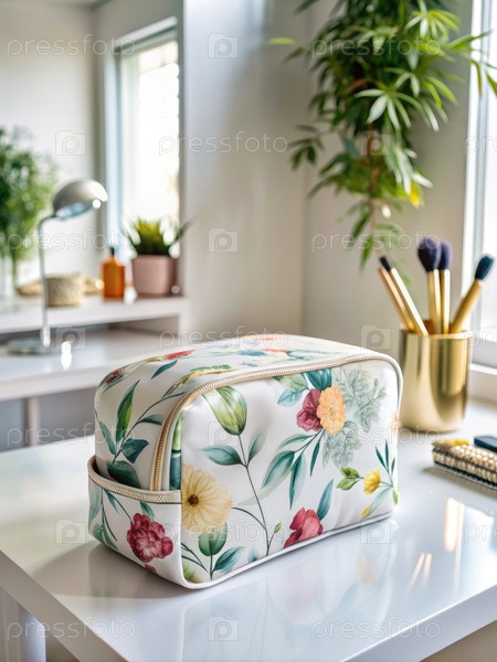 Цветочный косметический пакет на белом столе рядом с окном