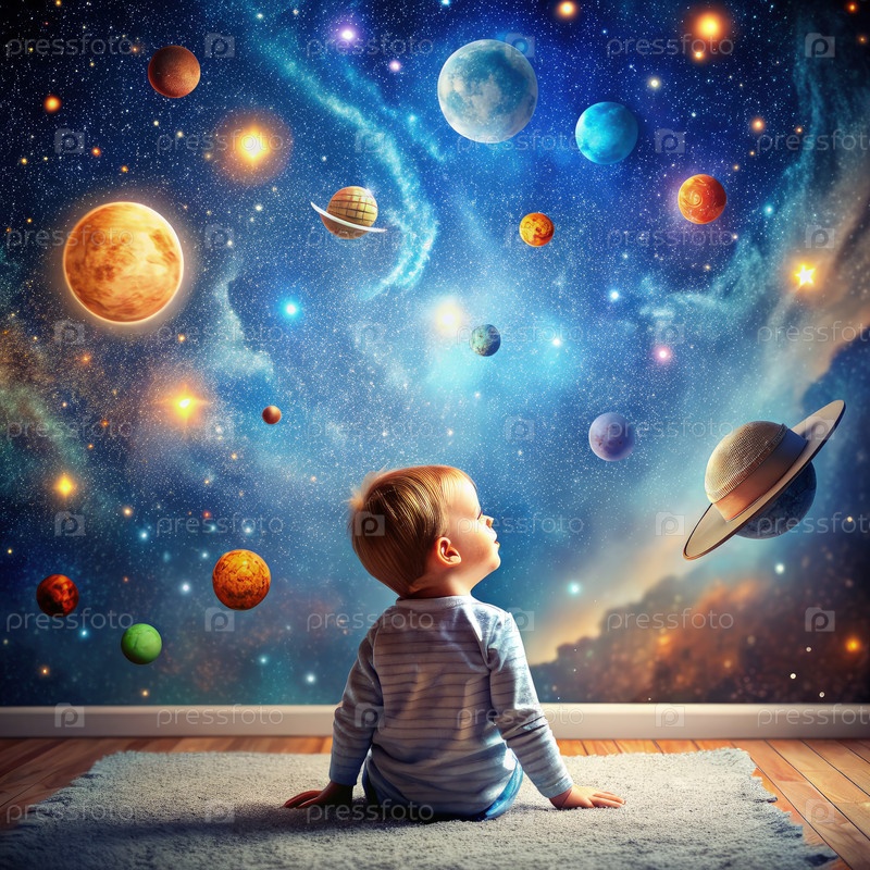 Маленький ребенок смотрит на окрашенное ночное небо в детской